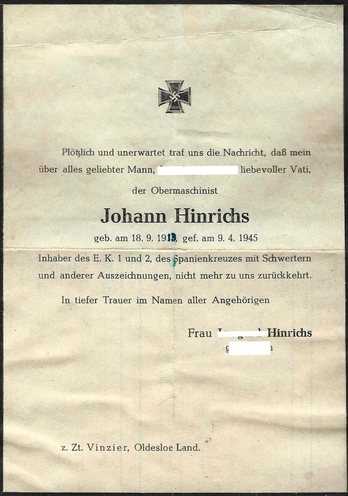 Johann Hinrichs war Berufssoldat und gehörte bereits vor seiner Dienstzeit auf dem SCHEER der Stammbesatzung der HESSEN an. Er nahm als Mitglied der Besatzung an vielen Unternehmungen teil - so unter anderem auch an den Spanien-Einsätzen, der "Großen Feindfahrt" und am Unternehmen Wunderland. Als Obermaschinist trug er die Verantwortung für den "Herzschlag", den Antrieb, des SCHEER mit. Er war vom Anfang bis zum Ende mit dem ADMIRAL SCHEER verbunden: Von der Indienststellung bis zum Kentern von SOPHIE CAESAR. Er kam beim Angriff auf das letzte noch verbliebene Panzerschiff am 09. April 1945 um. Es gab verschiedene Geschichten, warum er an Bord gewesen ist, aber die plausibelste ist, dass er zu den noch an Bord verbliebenen Sicherungsmannschaften gehörte. Sein Leichnam wurde nie geborgen oder zumindest nicht identifiziert...