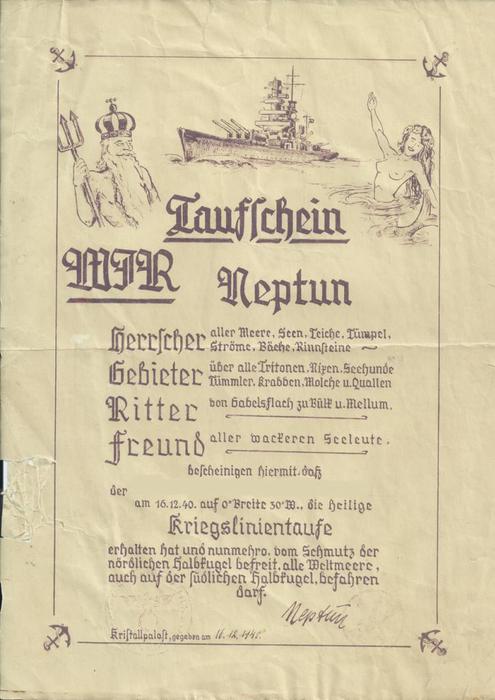 Ich bedanke mich bei seinem Enkelsohn, Herrn Lee Rehorn, herzlich für die Informationen und die Genehmigung zur Veröffentlichung von Persönlichem und der Urkunde zur Äquatortaufe.